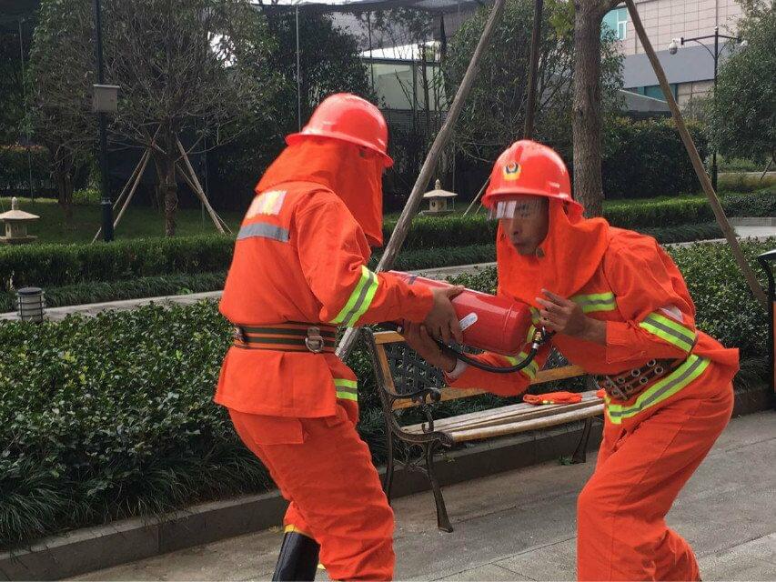 第一天首先進(jìn)行的是商管組。商管組比賽內(nèi)容是4*100米接力滅火操作及二人二盤水袋連接出水操作。4*100米接力滅火比賽規(guī)則為第一名參賽隊(duì)員聽到預(yù)備口令時(shí),在起點(diǎn)線做好起跑準(zhǔn)備,另外3名隊(duì)員分別在100米處和起點(diǎn)線做好交接準(zhǔn)備,輔助人員將油盆的火點(diǎn)燃。聽到起跑信號(hào),第一名隊(duì)員立即拿起滅火器向前跑(第一次搶跑重跑,第二次再搶跑的不記取成績),到100米處將滅火器交給第二名隊(duì)員,其他隊(duì)員以此類推。第四名隊(duì)員攜帶滅火器跑至油盆區(qū),利用滅火器將油盆的火撲滅后沖出終點(diǎn)線。二人二盤水袋比賽規(guī)則為連接出水操作聽到“開始”的口令或信號(hào),第一名隊(duì)員先甩開第一盤水帶,將一端接口交給第二名隊(duì)員,第二名隊(duì)員將水帶連接在分水器上,做好出水準(zhǔn)備;第一名隊(duì)員攜帶水帶另一端和另一盤水帶向射水線跑動(dòng),在跑動(dòng)過程中將第一盤的水帶接口與第二盤水帶進(jìn)行連接并鋪設(shè)好第二盤水帶,動(dòng)作完成后連接好水槍在射水線做好打靶準(zhǔn)備,然后示意第一名隊(duì)員出水,待水槍出水后將靶打到。
