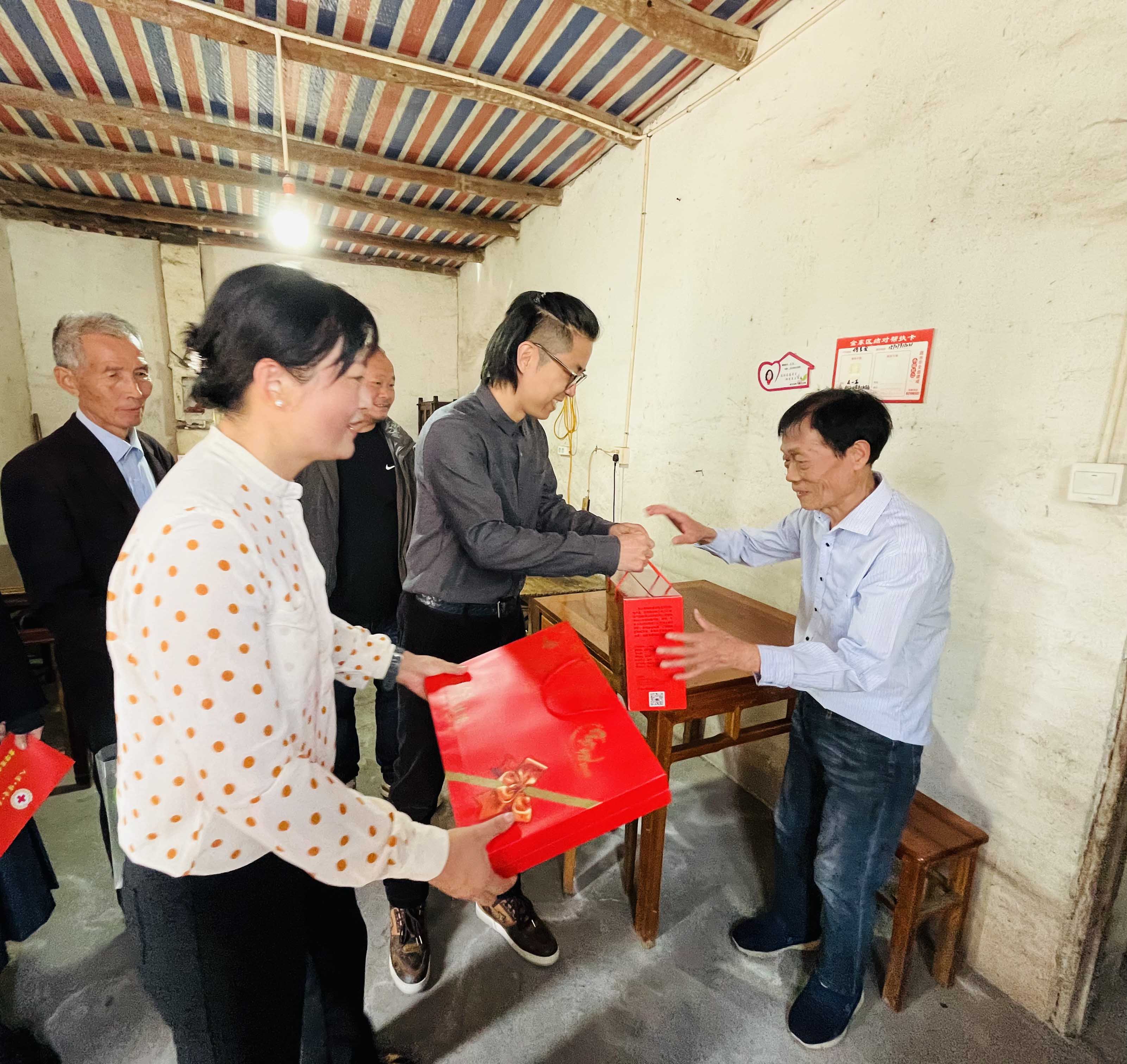 “重陽節(jié)快樂,祝你們健康長壽!”在村領(lǐng)導(dǎo)的陪同下,蔣晨虹董事長、傅融總裁一行走訪了村里的困難家庭,為他們送上慰問金及食物、被子、洗浴用品等生活物資,并與他們親切交談,關(guān)心詢問他們的身體狀況和生活情況。這不僅讓困難家庭感受到了社會的溫暖和關(guān)懷,也進一步體現(xiàn)了金廈對弱勢群體的關(guān)注和支持。