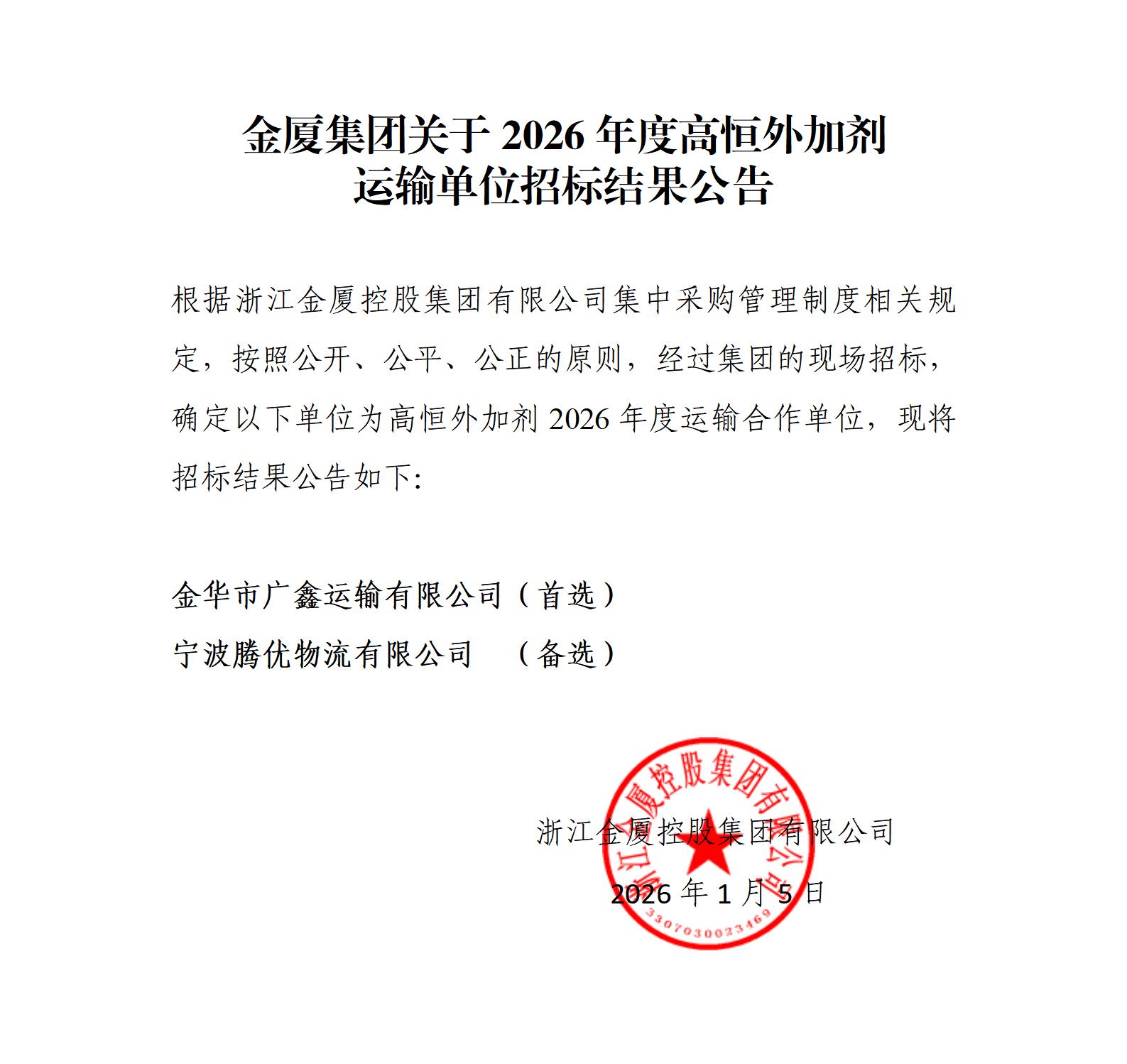 金廈集團關(guān)于2026年度高恒外加劑 母液戰(zhàn)略合作供應(yīng)商招標(biāo)結(jié)果公告